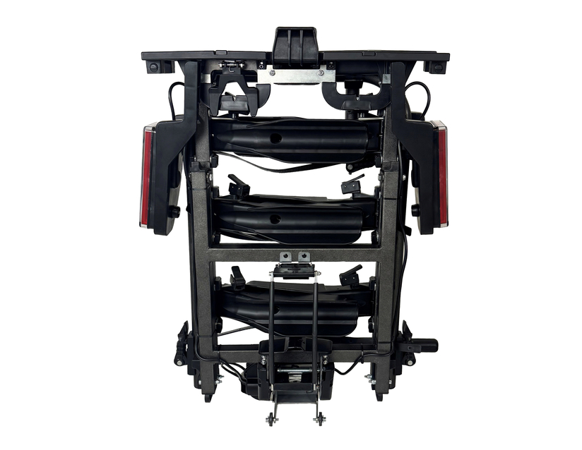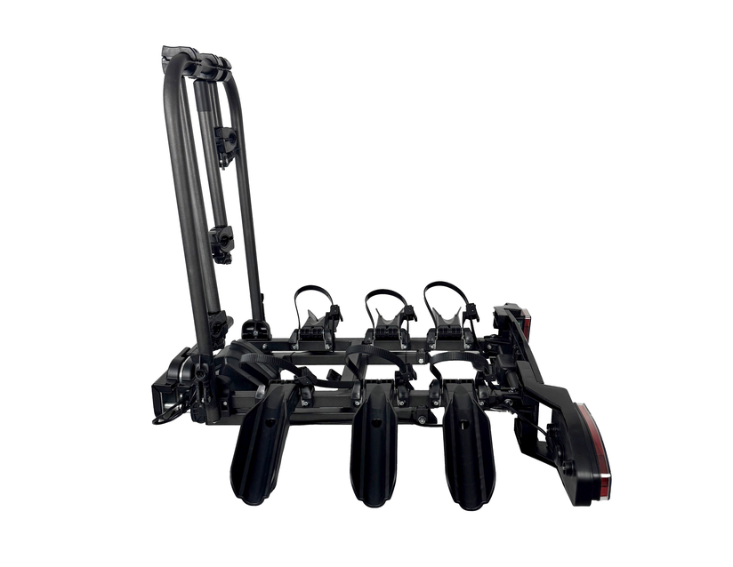 Vonóhorogra szerelhető kerékpártartó 3 kerékpárhoz. Szerszámok nélkül, egyszerűen felszerelhető. Közvetlenül a jármű vonóhorogjára rögzíthető, így azonnal használatra kész. Minden kerékpárhoz alkalmas. A kerékpárok a csomagtartóhoz, a csomagtartó pedig a vonóhoroghoz rögzíthető. A kerékpárokkal együtt a komplett tartó összecsukható, így egy lábpedállal közvetlenül hozzáférhet a raktérhez.